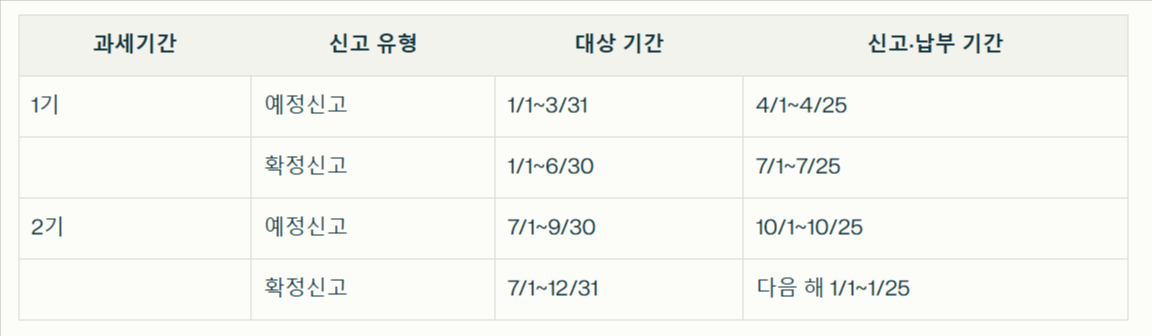 예정신고는 매년 4월과 10월에 이루어지며, 직전 과세기간의 매출액을 기준으로 납부해야 할 세액을 계산합니다[2].